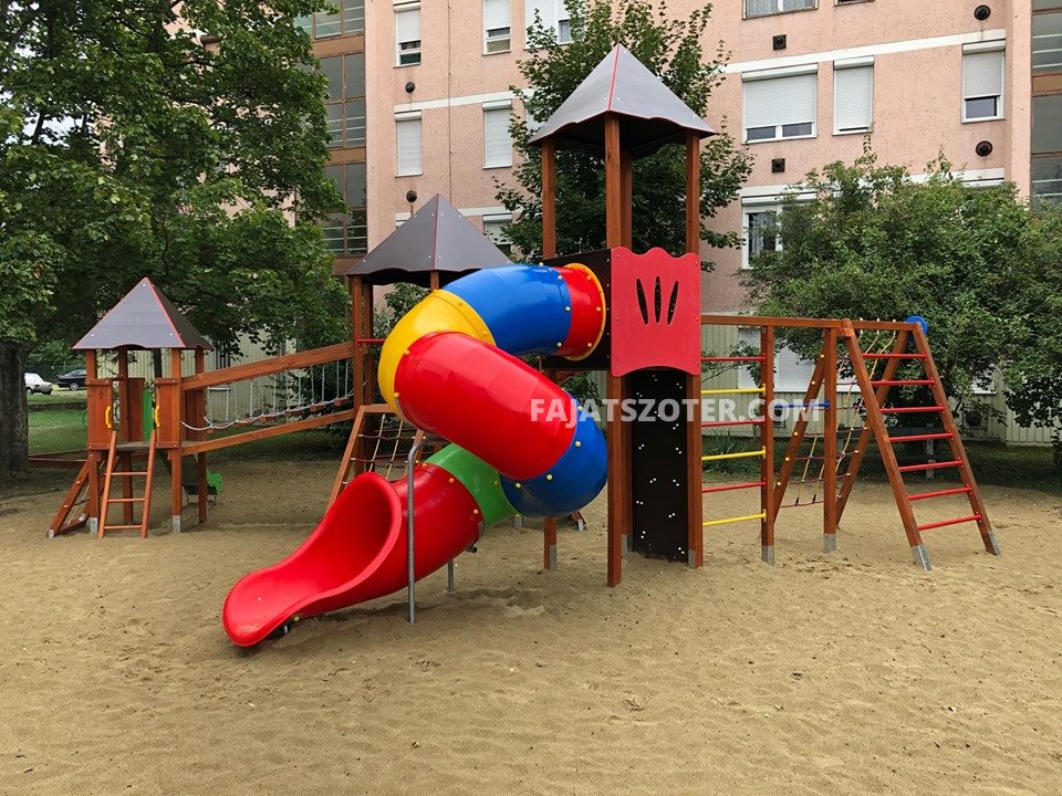 | Alapanyag | Telített borovi fenyő szerkezet, acél lábak és szerkezeti elemek, acélbetétes kötél, műanyag csúszdapálya, rétegelt lemez, HDPE lap |