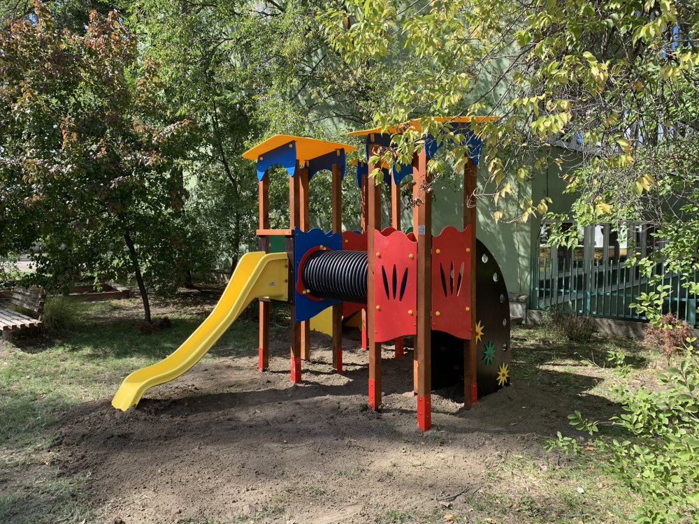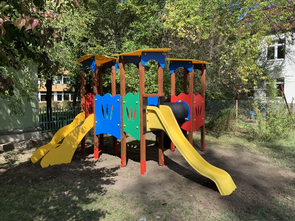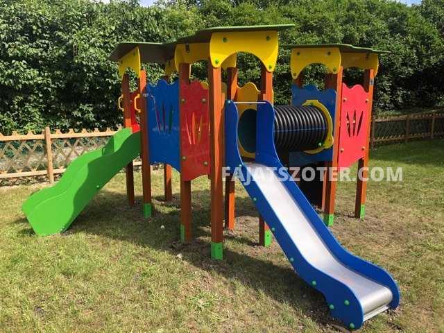 | Alapanyag | Telített borovifenyő tartószerkezet, porfestett fém részek, HDPE oldalfalak, polyeszter csúszdatest, csúszásmentes padlózat |
