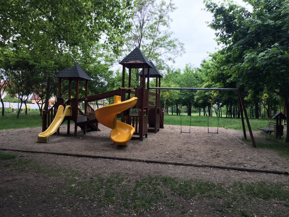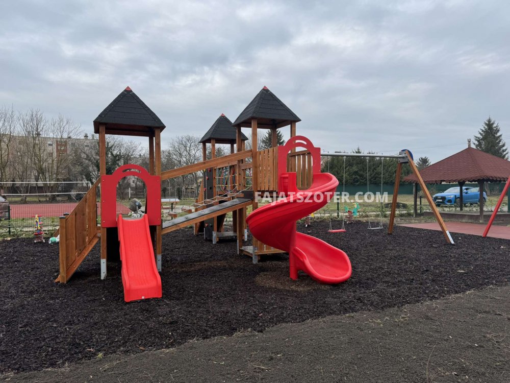 | Alapanyag | Telitett borovi fenyő tartóoszlopokból és telitett deszkákból álló eszköz. A csúszdatestek duplafalú müanyagből és polyeszterből készültek, a kötelek acélbetétesek, melyeket roppanó csomópontokkal rögzitettek, a hinta felső rudja minősitett acélból készült, melyen 2 db alubetétes gumibevonatos hintaülőke van felszerelve. A mászókövek müanyagból vannak. |